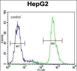SERPINI1 Antibody (N-term) (Cat. #P30762) flow cytometric analysis of HepG2 cells (right histogram) compared to a negative control cell (left histogram).FITC-conjugated goat-anti-rabbit secondary antibodies were used for the analysis. |