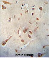 SERPINI1 antibody (N-term) (Cat. #P30762) immunohistochemistry analysis in formalin fixed and paraffin embedded human brain tissue followed by peroxidase conjugation of the secondary antibody and DAB staining. This data demonstrates the use of the SERPINI1 antibody (N-term) for immunohistochemistry. Clinical relevance has not been evaluated. |