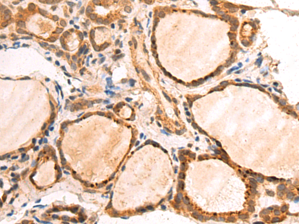 The image is immunohistochemistry of paraffin-embedded Human thyroid cancer tissue using P12162(SESN2 Antibody) at dilution 1/50. (Original magnification: ×200) |