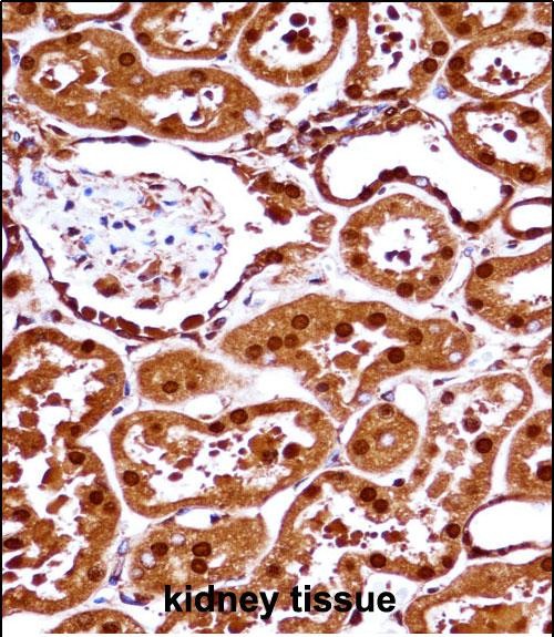 SET Antibody (N-term) (P31497)immunohistochemistry analysis in formalin fixed and paraffin embedded human kidney tissue followed by peroxidase conjugation of the secondary antibody and DAB staining.This data demonstrates the use of SET Antibody (N-term) for immunohistochemistry. Clinical relevance has not been evaluated. |
