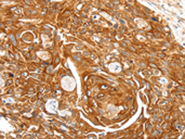 The image is immunohistochemistry of paraffin-embedded Human esophagus cancer tissue using P04465(SFTPA1 Antibody) at dilution 1/30. (Original magnification: ×200) |
