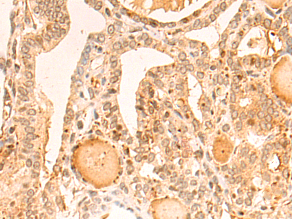 The image is immunohistochemistry of paraffin-embedded Human thyroid cancer tissue using P13257(SGCG Antibody) at dilution 1/55. (Original magnification: ×200) |