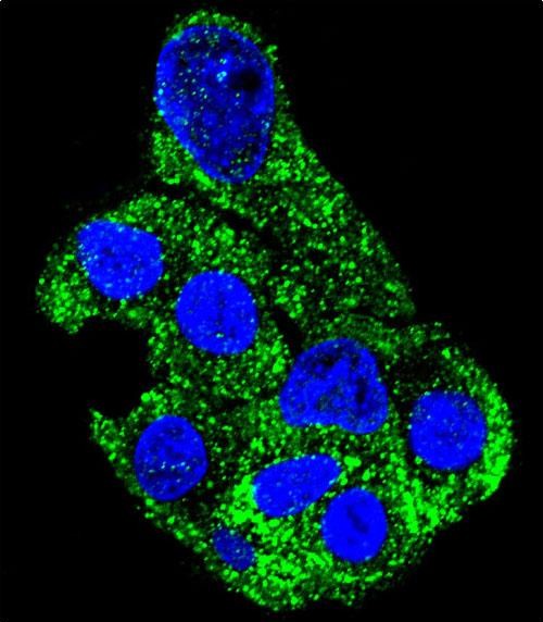 Confocal immunofluorescent analysis of SH2D4B Antibody (C-term)(Cat#P31009) with HepG2 cell followed by Alexa Fluor 488-conjugated goat anti-rabbit lgG (green). DAPI was used to stain the cell nuclear (blue). |