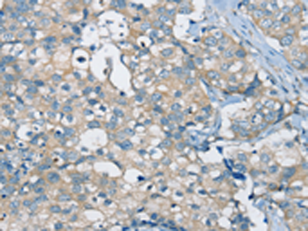 The image is immunohistochemistry of paraffin-embedded Human breast cancer tissue using P12165(SIAH2 Antibody) at dilution 1/20. (Original magnification: ×200) |