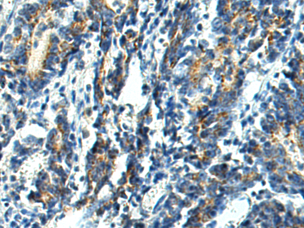 The image is immunohistochemistry of paraffin-embedded Human gastric cancer tissue using P05293(SLC16A11 Antibody) at dilution 1/50. (Original magnification: ×200) |