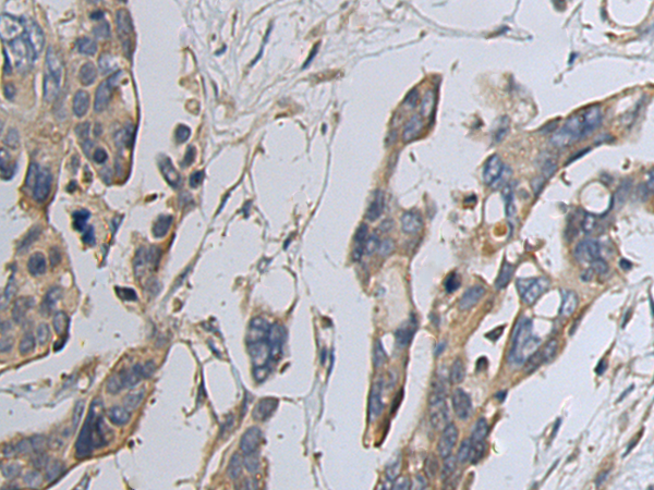 The image is immunohistochemistry of paraffin-embedded Human colorectal cancer tissue using P05809(SLC16A6 Antibody) at dilution 1/45. (Original magnification: ×200) |