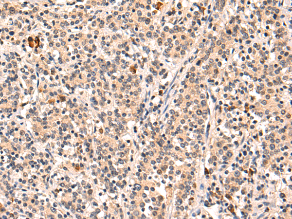 The image is immunohistochemistry of paraffin-embedded Human gastric cancer tissue using P06011(SLC17A8 Antibody) at dilution 1/50. (Original magnification: ×200) |