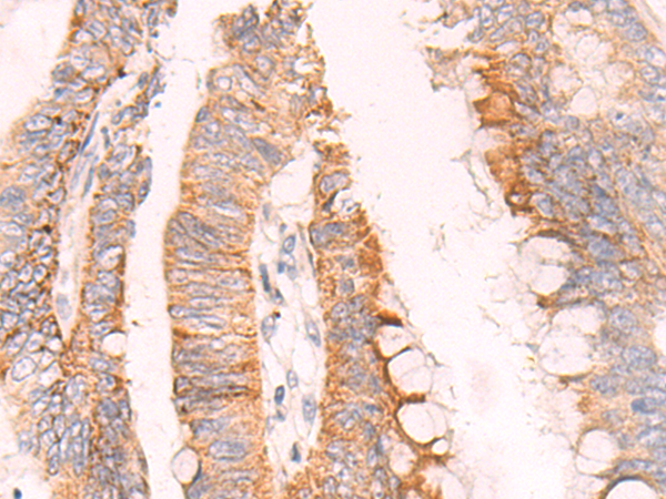 The image is immunohistochemistry of paraffin-embedded Human colorectal cancer tissue using P04198(SLC1A5 Antibody) at dilution 1/50. (Original magnification: ×200) |