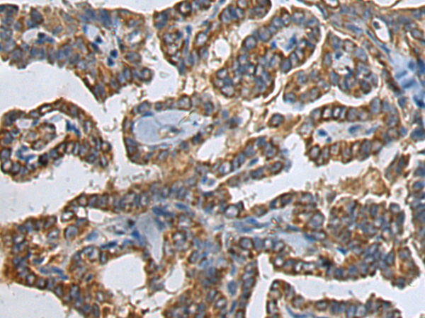 The image is immunohistochemistry of paraffin-embedded Human thyroid cancer tissue using P12004(SLC22A12 Antibody) at dilution 1/25. (Original magnification: ×200) |