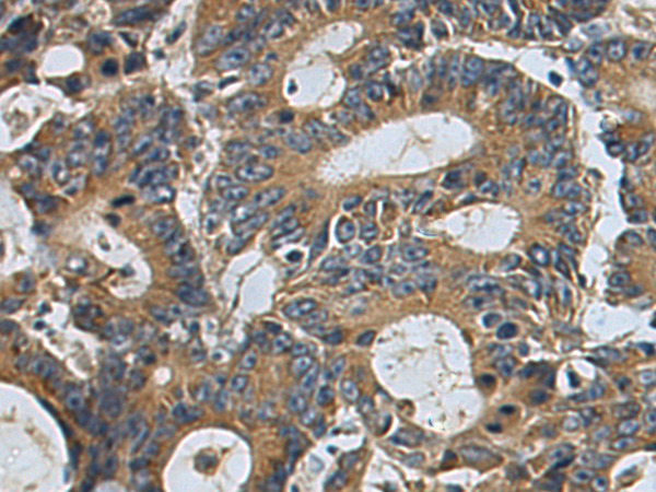The image is immunohistochemistry of paraffin-embedded Human colorectal cancer tissue using P12004(SLC22A12 Antibody) at dilution 1/25. (Original magnification: ×200) |