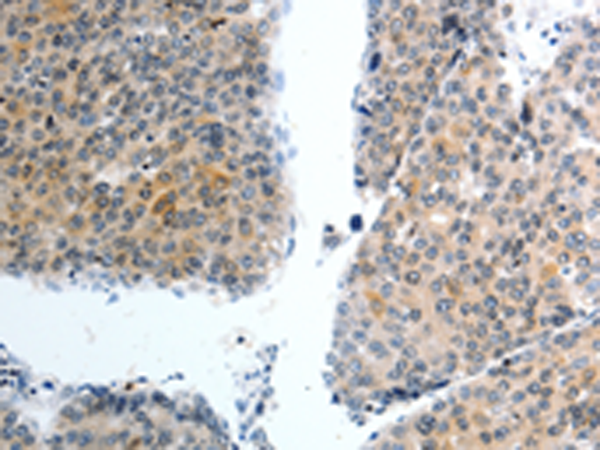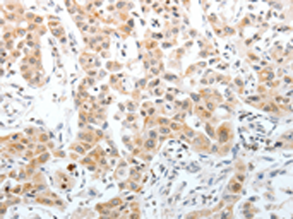 The image is immunohistochemistry of paraffin-embedded Human liver cancer tissue using P11348(SLC22A3 Antibody) at dilution 1/40. (Original magnification: ×200) |