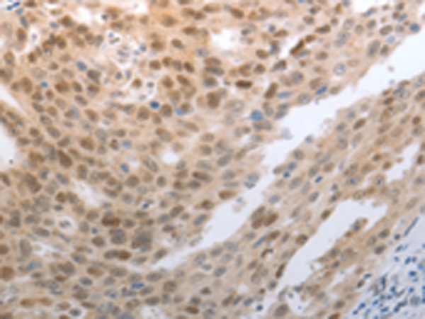 The image is immunohistochemistry of paraffin-embedded Human ovarian cancer tissue using P11298(SLC22A8 Antibody) at dilution 1/70. (Original magnification: ×200) |
