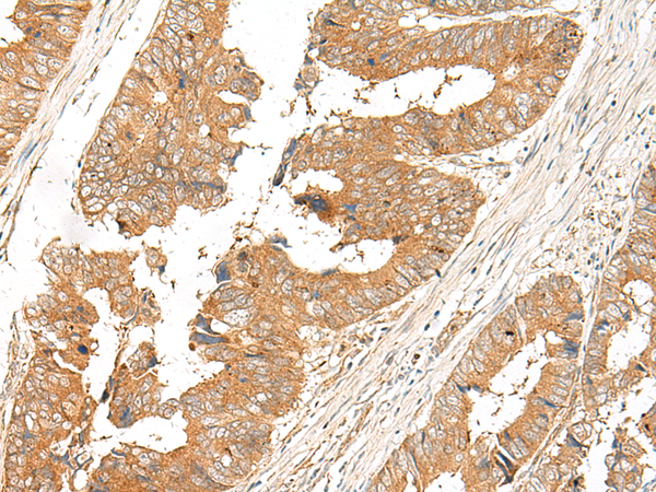 The image is immunohistochemistry of paraffin-embedded Human colorectal cancer tissue using P06572(SLC2A8 Antibody) at dilution 1/20. (Original magnification: ×200) |