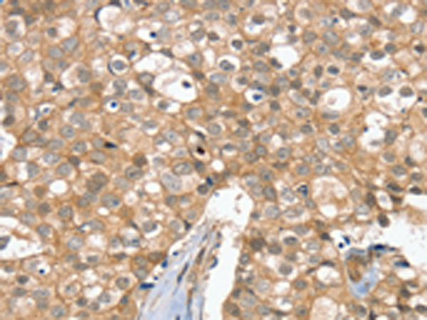 The image is immunohistochemistry of paraffin-embedded Human breast cancer tissue using P12201(SLC6A7 Antibody) at dilution 1/30. (Original magnification: ×200) |