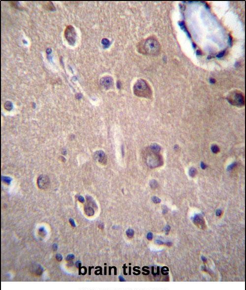 SLC8A3 Antibdy (C-term) (Cat. #P31166)immunohistochemistry analysis in formalin fixed and paraffin embedded human brain tissue followed by peroxidase conjugation of the secondary antibody and DAB staining.This data demonstrates the use of SLC8A3 Antibdy (C-term) for immunohistochemistry. Clinical relevance has not been evaluated. |