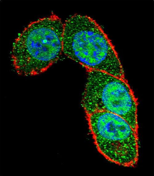 Confocal immunofluorescent analysis of SMAD3 Antibody (Center)(Cat#P31307) with Hela cell followed by Alexa Fluor 488-conjugated goat anti-rabbit lgG (green). Actin filaments have been labeled with Alexa Fluor 555 phalloidin (red).DAPI was used to stain the cell nuclear (blue). |