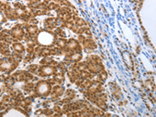 The image is immunohistochemistry of paraffin-embedded Human thyroid cancer tissue using P03793(SMARCA4 Antibody) at dilution 1/50. (Original magnification: ×200) |