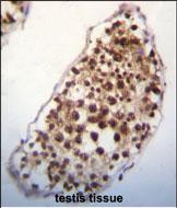 SNRK Antibody (Center) (Cat. #P31153)immunohistochemistry analysis in formalin fixed and paraffin embedded human testis tissue followed by peroxidase conjugation of the secondary antibody and DAB staining.This data demonstrates the use of SNRK Antibody (Center) for immunohistochemistry. Clinical relevance has not been evaluated. |