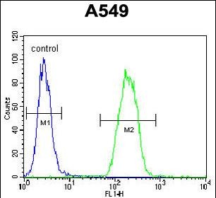 SNX24 Antibody (N-term) (Cat. #P30974) flow cytometric analysis of A549 cells (right histogram) compared to a negative control cell (left histogram).FITC-conjugated goat-anti-rabbit secondary antibodies were used for the analysis. |