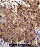 SNX24 Antibody (N-term) (Cat. #P30974)immunohistochemistry analysis in formalin fixed and paraffin embedded human breast carcinoma followed by peroxidase conjugation of the secondary antibody and DAB staining.This data demonstrates the use of SNX24 Antibody (N-term) for immunohistochemistry. Clinical relevance has not been evaluated. |