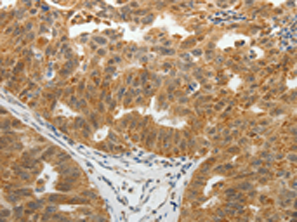 The image is immunohistochemistry of paraffin-embedded Human ovarian cancer tissue using P11124(SOCS7 Antibody) at dilution 1/30. (Original magnification: ×200) |