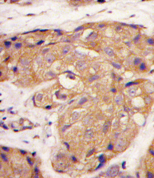 Formalin-fixed and paraffin-embedded human breast carcinoma tissue reacted with SOST antibody (N-term)(Cat.#P32862), which was peroxidase-conjugated to the secondary antibody, followed by DAB staining. This data demonstrates the use of this antibody for immunohistochemistry; clinical relevance has not been evaluated. |