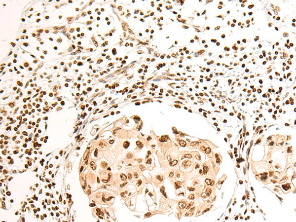 The image is immunohistochemistry of paraffin-embedded Human breast cancer tissue using P03556(SP110 Antibody) at dilution 1/85. (Original magnification: ×200) |
