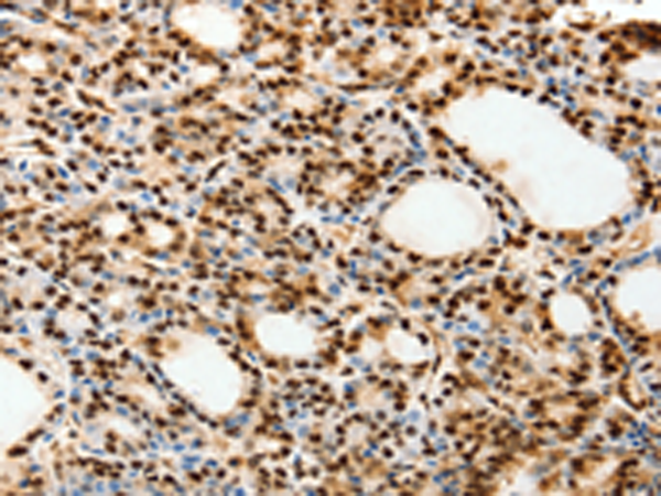 The image is immunohistochemistry of paraffin-embedded Human thyroid cancer tissue using P11359(SPATA20 Antibody) at dilution 1/70. (Original magnification: ×200) |