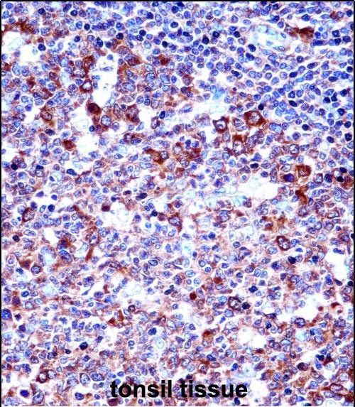 SPN/CD43 Antibody (Center) (P31395)immunohistochemistry analysis in formalin fixed and paraffin embedded human tonsil tissue followed by peroxidase conjugation of the secondary antibody and DAB staining.This data demonstrates the use of SPN/CD43 Antibody (Center) for immunohistochemistry. Clinical relevance has not been evaluated. |