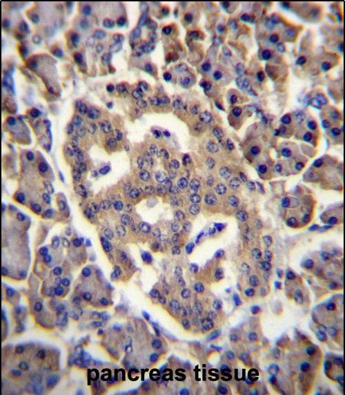 SPNS3 Antibody (C-term) (Cat. #P31131)immunohistochemistry analysis in formalin fixed and paraffin embedded human pancreas tissue followed by peroxidase conjugation of the secondary antibody and DAB staining.This data demonstrates the use of SPNS3 Antibody (C-term) for immunohistochemistry. Clinical relevance has not been evaluated. |