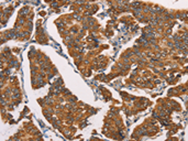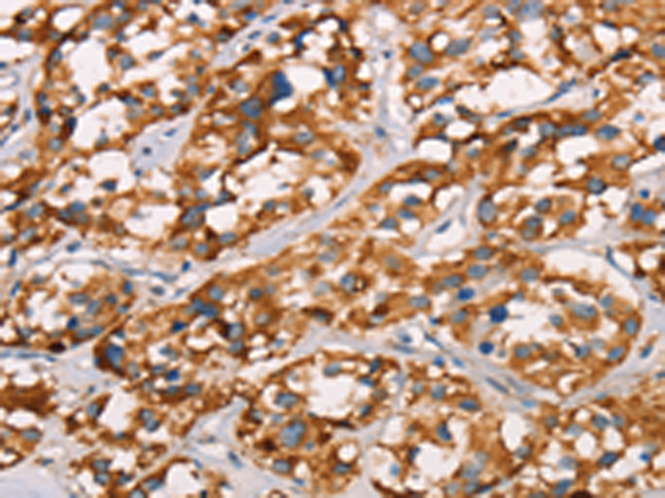 The image is immunohistochemistry of paraffin-embedded Human thyroid cancer tissue using P04651(SPR Antibody) at dilution 1/40. (Original magnification: ×200) |