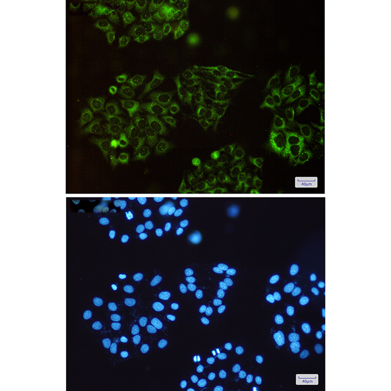 Immunocytochemistry analysis of SQSTM1/p62(green) in Hela using SQSTM1/p62 antibody,and DAPI(blue). |