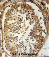 SRAC1 Antibody (C-term) (Cat. #P30852) immunohistochemistry analysis in formalin fixed and paraffin embedded human testis carcinoma followed by peroxidase conjugation of the secondary antibody and DAB staining. This data demonstrates the use of the SRAC1 Antibody (C-term) for immunohistochemistry. Clinical relevance has not been evaluated. |