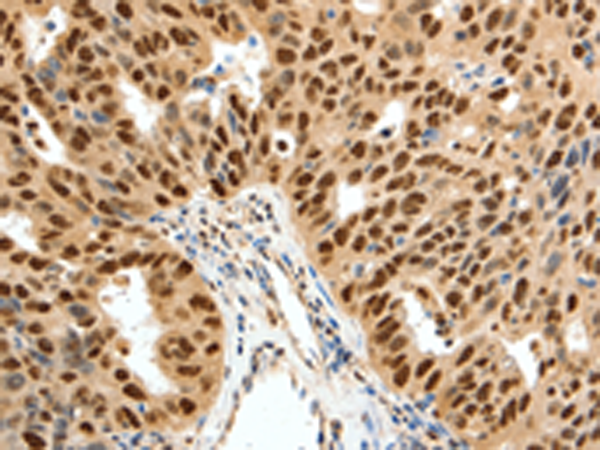 The image is immunohistochemistry of paraffin-embedded Human ovarian cancer tissue using P11360(SSB Antibody) at dilution 1/50. (Original magnification: ×200) |