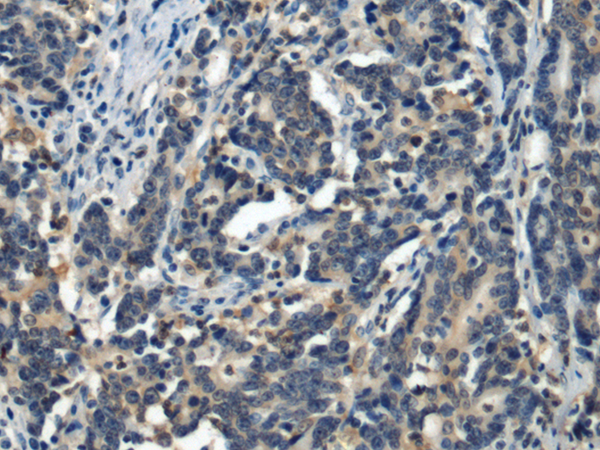The image is immunohistochemistry of paraffin-embedded Human gastric cancer tissue using P04474(SSTR5 Antibody) at dilution 1/40. (Original magnification: ×200) |