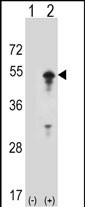 Western blot analysis of STAM (arrow) using rabbit polyclonal STAM Antibody (D10) (Cat. #P30071). 293 cell lysates (2 ug/lane) either nontransfected (Lane 1) or transiently transfected (Lane 2) with the STAM gene. |