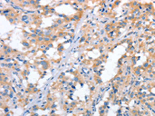 The image is immunohistochemistry of paraffin-embedded Human thyroid cancer tissue using P04688(STAT2 Antibody) at dilution 1/40. (Original magnification: ×200) |
