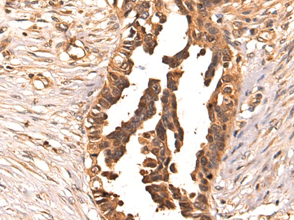 The image is immunohistochemistry of paraffin-embedded Human colorectal cancer tissue using P03589(STIP1 Antibody) at dilution 1/80. (Original magnification: ×200) |
