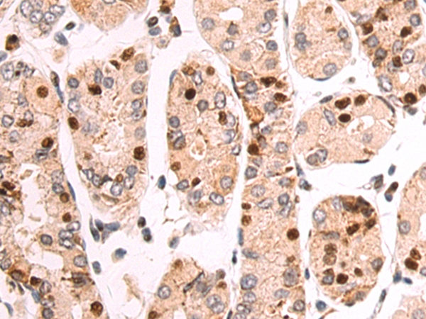 The image is immunohistochemistry of paraffin-embedded Human gastric cancer tissue using P05901(STK11 Antibody) at dilution 1/50. (Original magnification: ×200) |