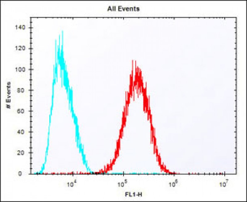 Overlay histogram showing HepG2 cells stained with P32920 (red line). The cells were fixed with 2% paraformaldehyde (10 min) and then permeabilized with 90% methanol for 10 min. The cells were then icubated in 2% bovine serum albumin to block non-specific protein-protein interactions followed by the antibody (P32920, 1:25 dilution) for 60 min at 37ºC. The secondary antibody used was Alexa Fluor® 488 goat anti-rabbit lgG (H+L) (1583138) at 1/400 dilution for 40 min at 37ºC. Isotype control antibody (blue line) was rabbit IgG1 (1μg/1×10^6 cells) used under the same conditions. Acquisition of >10, 000 events was performed. |