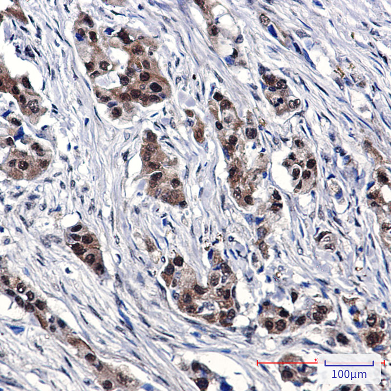 Immunohistochemistry analysis of paraffin-embedded Human lung cancer using Sumo 1 antibody.High-pressure and temperature Sodium Citrate pH 6.0 was used for antigen retrieval. |