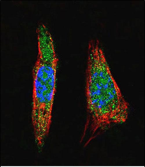 Confocal immunofluorescent analysis of SUMO1 Antibody (N-term)(Cat#P30003) with A375 cell followed by Alexa Fluor 488-conjugated goat anti-rabbit lgG (green).Actin filaments have been labeled with Alexa Fluor 555 phalloidin (red).DAPI was used to stain the cell nuclear (blue). |