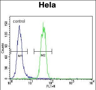SUMO1 Antibody (N-term) (Cat. #P30003) flow cytometric analysis of Hela cells (right histogram) compared to a negative control cell (left histogram).FITC-conjugated goat-anti-rabbit secondary antibodies were used for the analysis. |