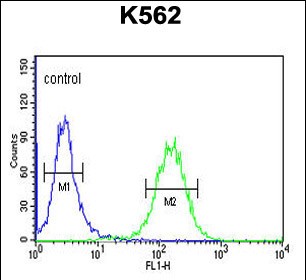 SUPV3L1 Antibody (N-term) (Cat. #P32865) flow cytometric analysis of K562 cells (right histogram) compared to a negative control cell (left histogram).FITC-conjugated goat-anti-rabbit secondary antibodies were used for the analysis. |