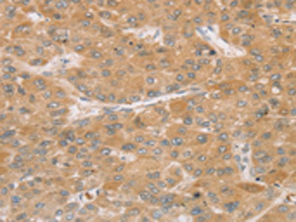 The image is immunohistochemistry of paraffin-embedded Human liver cancer tissue using P12274(TBC1D21 Antibody) at dilution 1/30. (Original magnification: ×200) |
