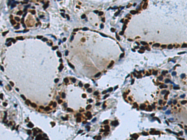 The image is immunohistochemistry of paraffin-embedded Human thyroid cancer tissue using P12632(TBX3 Antibody) at dilution 1/35. (Original magnification: ×200) |