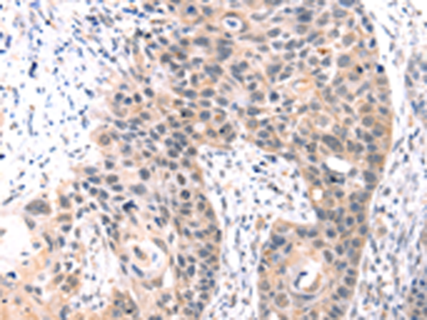 The image is immunohistochemistry of paraffin-embedded Human esophagus cancer tissue using P05399(TCERG1L Antibody) at dilution 1/30. (Original magnification: ×200) |
