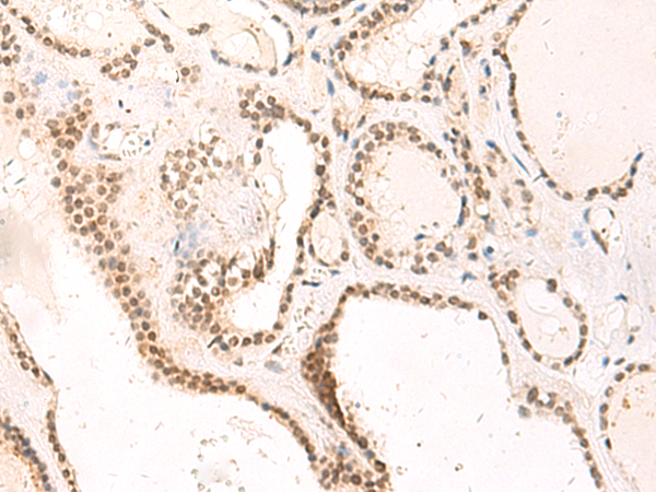 The image is immunohistochemistry of paraffin-embedded Human thyroid cancer tissue using P03090(TEAD3 Antibody) at dilution 1/50. (Original magnification: ×200) |