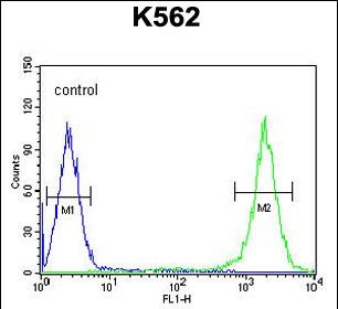TFAM Antibody (C-term) (Cat. #P32879) flow cytometric analysis of K562 cells (right histogram) compared to a negative control cell (left histogram).FITC-conjugated goat-anti-rabbit secondary antibodies were used for the analysis. |