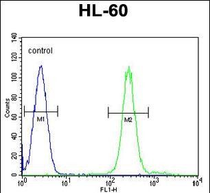 TGM6 Antibody (Center) (Cat. #P30903) flow cytometric analysis of HL-60 cells (right histogram) compared to a negative control cell (left histogram).FITC-conjugated goat-anti-rabbit secondary antibodies were used for the analysis. |